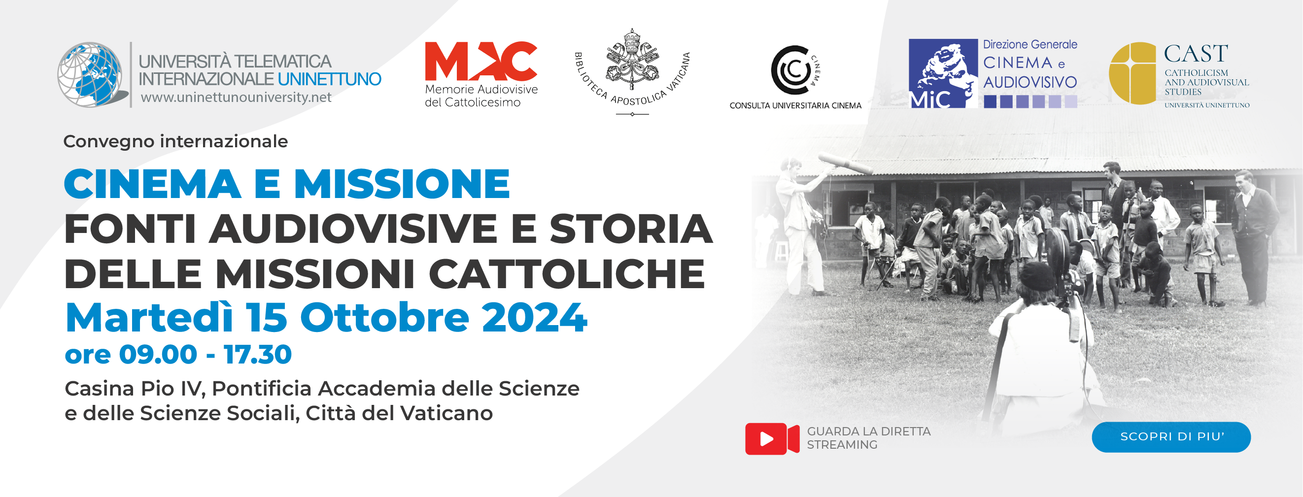 Martedì 15 ottobre si terrà dalle ore 09:00, presso la Casina Pio IVº in Vaticano, il Convegno internazionale “Cinema e missione. Fonti audiovisive e storia delle missioni cattoliche". L'evento è organizzato da UNINETTUNO, CAST (Catholicism and Audiovisual Studies) e la Fondazione MAC (Memorie Audiovisive del Cattolicesimo) in collaborazione con la Biblioteca Apostolica Vaticana, la Consulta Universitaria del Cinema, il Ministero della Cultura e l'Archivio storico di Propagande Fide.