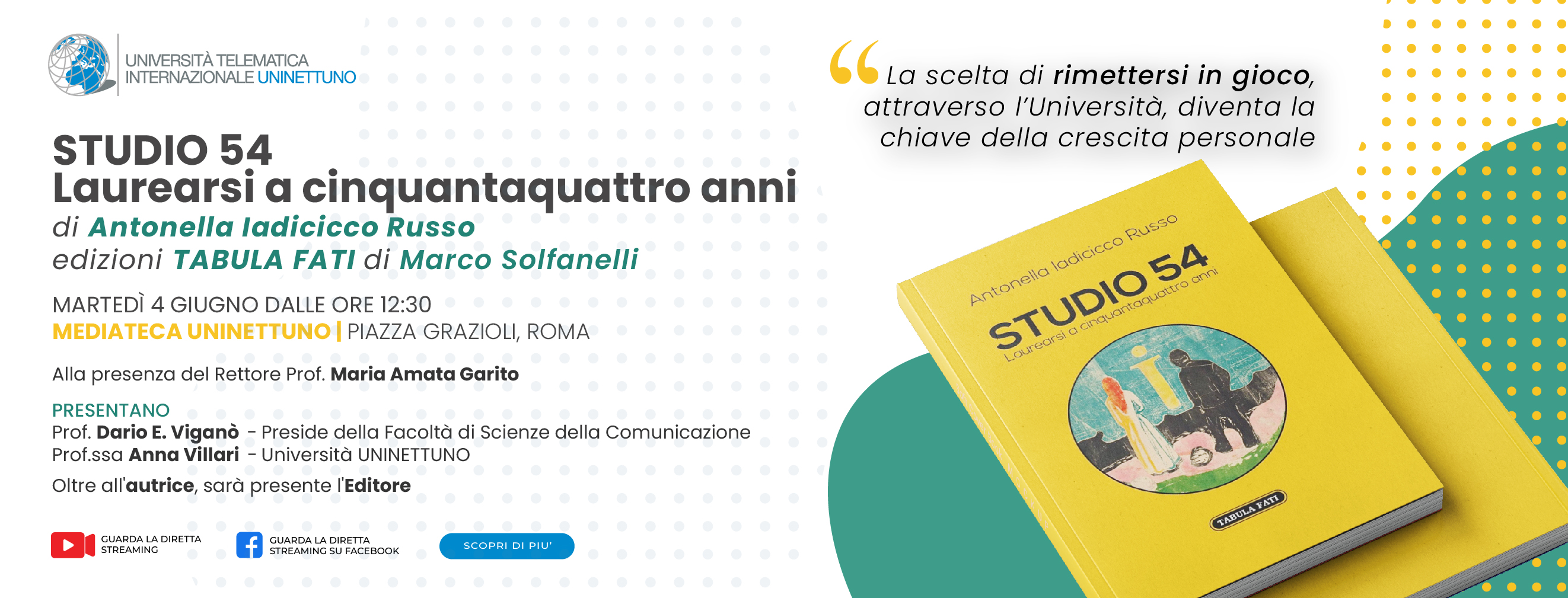 Martedì 4 giugno presso la Mediateca Uninettuno in Piazza Grazioli, Roma, si terrà la presentazione del libro "Studio 54 - Laurearsi a cinquantaquattro anni", scritto dall'ex studentessa Uninettuno Antonella Iadicicco Russo. Prima della pandemia da Covid-19, la protagonista ignorava che stava per affrontare l'avventura più sorprendente della sua vita. Aver deciso di rimettersi in gioco, all'età di 51 anni, si rileverà straordinario e inatteso. Nulla come l'iscrizione alla Facoltà di Scienze della Comunicazione avrebbe potuto rivelrasi più stimolante.