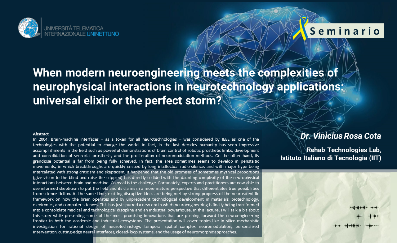 Venerdì 17 febbraio alle ore 14:30 è previsto il seminario dal titolo "When modern neuroengineering meets the complexities of neurophysical interactions in neurotechnology applications: universal elixir or the perfect storm?" organizzato dall'Università Telematica Internazionale UNINETTUNO e a cura del Prof. Vinicius Rosa Cota.