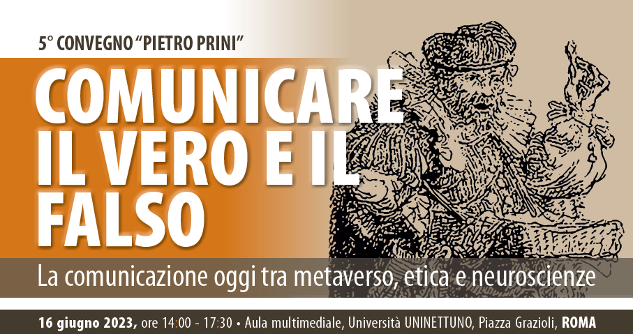 L'Università Telematica Internazionale UNINETTUNO presenta il V convegno 'Pietro Prini' dal titolo 'Comunicare il vero e il falso - La comunicazione oggi tra metaverso, etica e neuroscienze', in programma venerdì 16 giugno dalle ore 14:00 alle 17:30 presso l'Aula Multimediale dell'Università UNINETTUNO, a Piazza Grazioli 17, Roma.