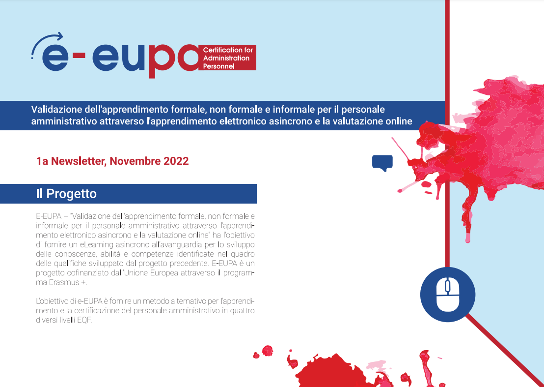 L’E-EUPA (Valutazione dell’apprendimento formale, non formale e informale per il personale amministrativo attraverso l’apprendimento elettronico asincrono e la valutazione online) è un progetto cofinanziato dall’Unione Europa attraverso il programma Erasmus+ che ha l’obiettivo di fornire un metodo alternativo per l’apprendimento e la certificazione del personale amministrativo in quattro diversi livelli EQF.  Tra i partner del progetto c’è anche l’Università Telematica Internazionale UNINETTUNO.