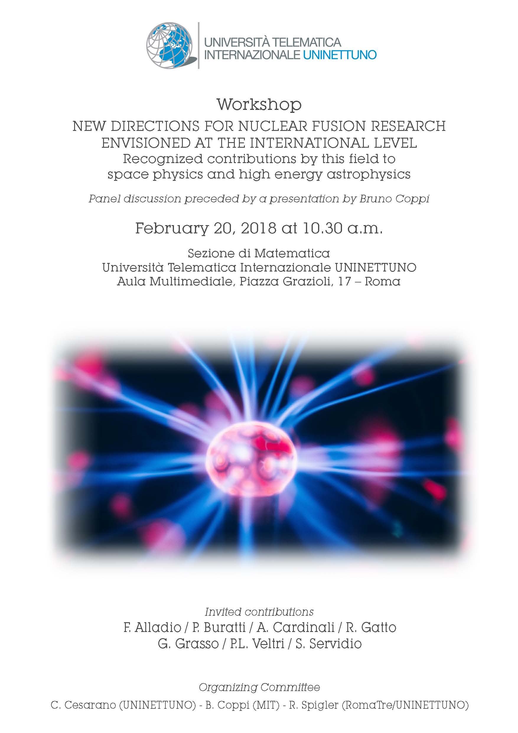 UNINETTUNO torna a ospitare il prof. Bruno Coppi, docente di Fisica al Massachusetts Institute of Technology e Premio Feltrinelli per la Chimica e la Fisica 2016. Il 20 febbraio, alle ore 10.30, nella Sala Multimediale dell’Ateneo (Piazza Grazioli, 17), Coppi apre il convegno dedicato a “New Directions for Nuclear Fusion Research Envisioned at the International Level”. Un incontro aperto a tutti – organizzato dalla Sezione di Matematica della Facoltà di Ingegneria UNINETTUNO – per fare il punto sullo stato dell’arte della ricerca internazionale sulla fusione nucleare. Ricerca che sta facendo grandi passi in avanti grazie anche al contributo di esperti di fisica dello spazio e di astrofisica dei plasmi.