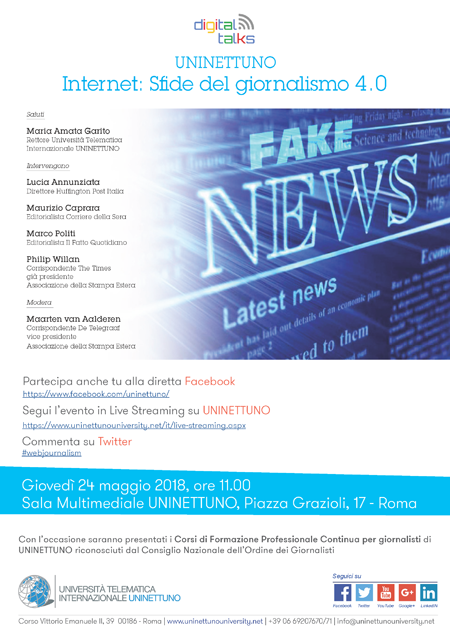 Se ne parlerà nel nuovo appuntamento con i Digital Talks UNINETTUNO, dedicato a "Internet: le sfide del giornalismo 4.0".