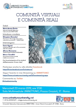 Rischi e potenzialità della Rete, la trasformazione della comunicazione, l'influenza dei Social media sui rapporti personali: di questo e tanto altro si parlerà nel nuovo appuntamento con i Digital Talks UNINETTUNO, dedicato a "Comunità virtuali e comunità reali".