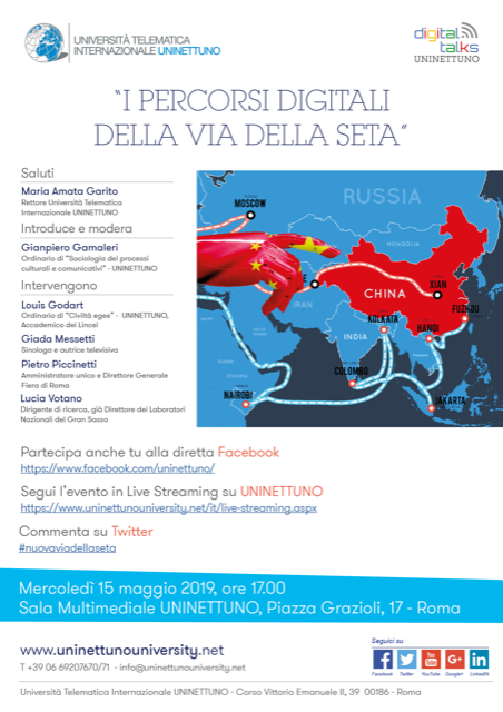 E come cambieranno e si potranno rafforzare le relazioni, non solo commerciali, con l’Italia con l’affermazione delle ultime tecnologie in ambito di Intelligenza Artificiale (IA)? A queste e altre domande rispondono insieme  al nuovo Digital Talk di UNINETTUNO dal titolo “I percorsi digitali della Via della Seta_ One Belt One Road” a seguito dei saluti del Rettore UNINETTUNO Maria Amata Garito, i Relatori: Gianpiero Gamaleri, Ordinario di “Sociologia dei processi culturali e comunicativi” – UNINETTUNO; Louis Godart, Ordinario di “Civiltà egee” – UNINETTUNO e Accademico dei Lincei; Giada Messetti, Sinologa e autrice televisiva; Pietro Piccinetti, Amministratore unico e Direttore Generale _ Fiera di Roma; Lucia Votano, Dirigente di ricerca, già Direttore dei Laboratori Nazionali del Gran Sasso.