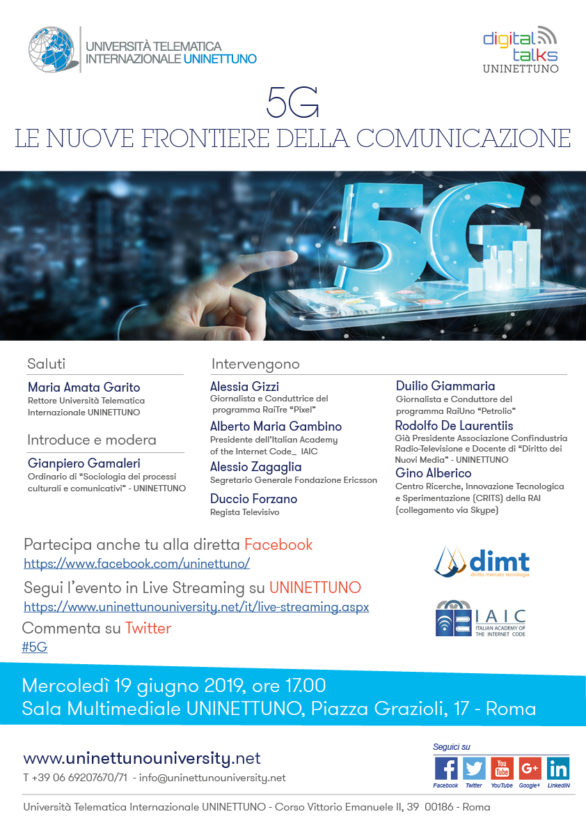 L’evento “5G. Le nuove frontiere della comunicazione”, sarà in diretta sulla pagina Facebook di UNINETTUNO (https://www.facebook.com/uninettuno/) e sul sito dell’Università https://www.uninettunouniversity.net/it/live-streaming.aspx). Gli interessati potranno inviare domande e commenti sulla pagina Facebook o su Twitter utilizzando l’hashtag #5G.