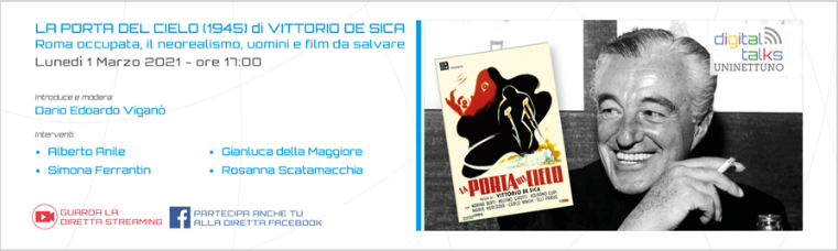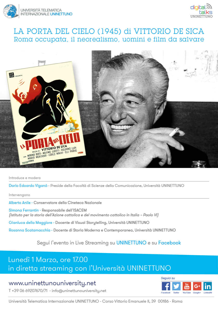 Lunedì 1 marzo alle ore 17:00 si tiene online il Digital Talk UNINETTUNO “La porta del cielo (1945) di Vittorio De Sica: Roma occupata, il neorealismo, uomini e film da salvare”.