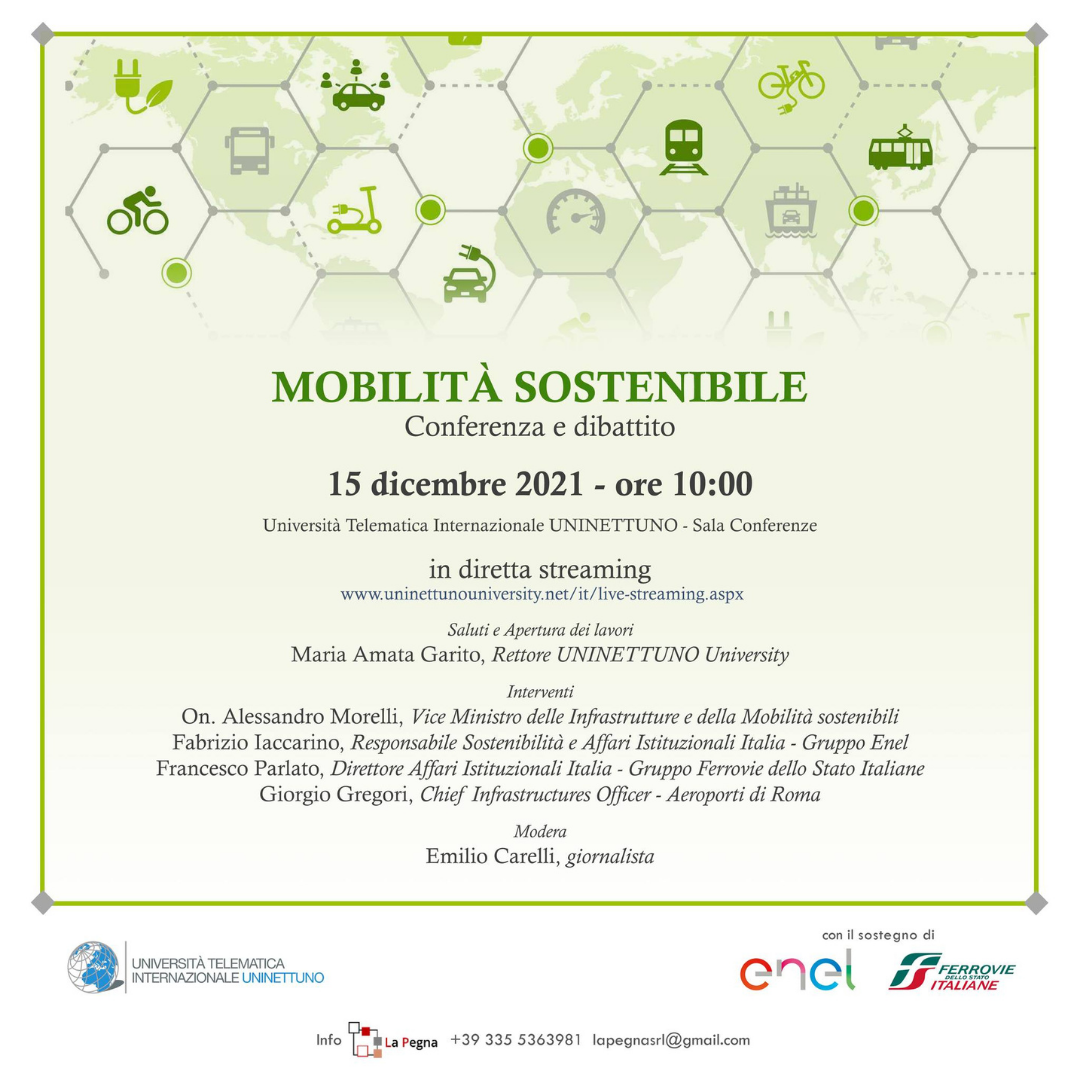 Mercoledì 15 dicembre alle ore 10:00, in collaborazione con Enel e Ferrovie dello Stato, si tiene la conferenza MOBILITÀ SOSTENIBILE, in diretta streaming dalla Sala Conferenze Uninettuno.